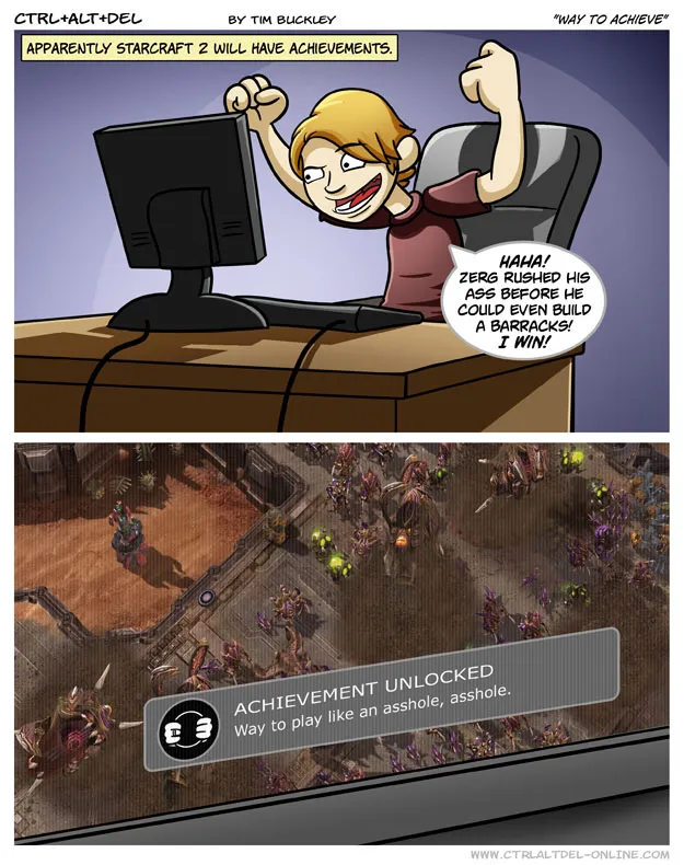 Итак, во-первых, нужно сделать интересные достижения, как в StarCraft 2, а не как в Modern Warfare 2 или Team Fortress 2. Т.е. именно те, которые бы делали игровой процесс более глубинным и интересным.