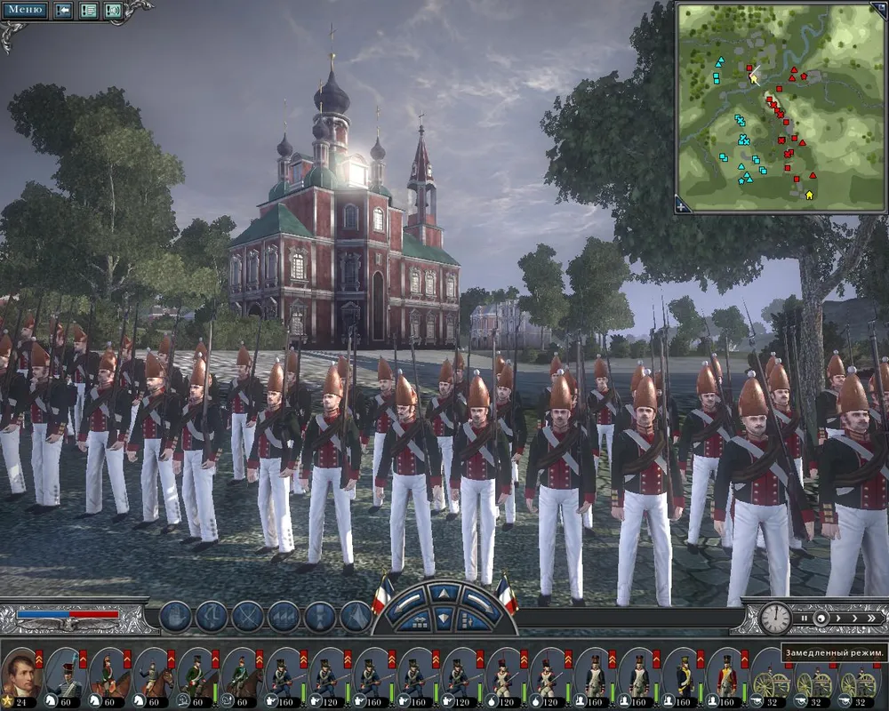 кадр из реконструкции Бородинского сражения: павлоградские гренадеры (элита, мечут гранаты в два раза дальше всех остальных) стерегут проход через узкий мосточек. из интерфейса их тихо ненавидит Бонапарт.
