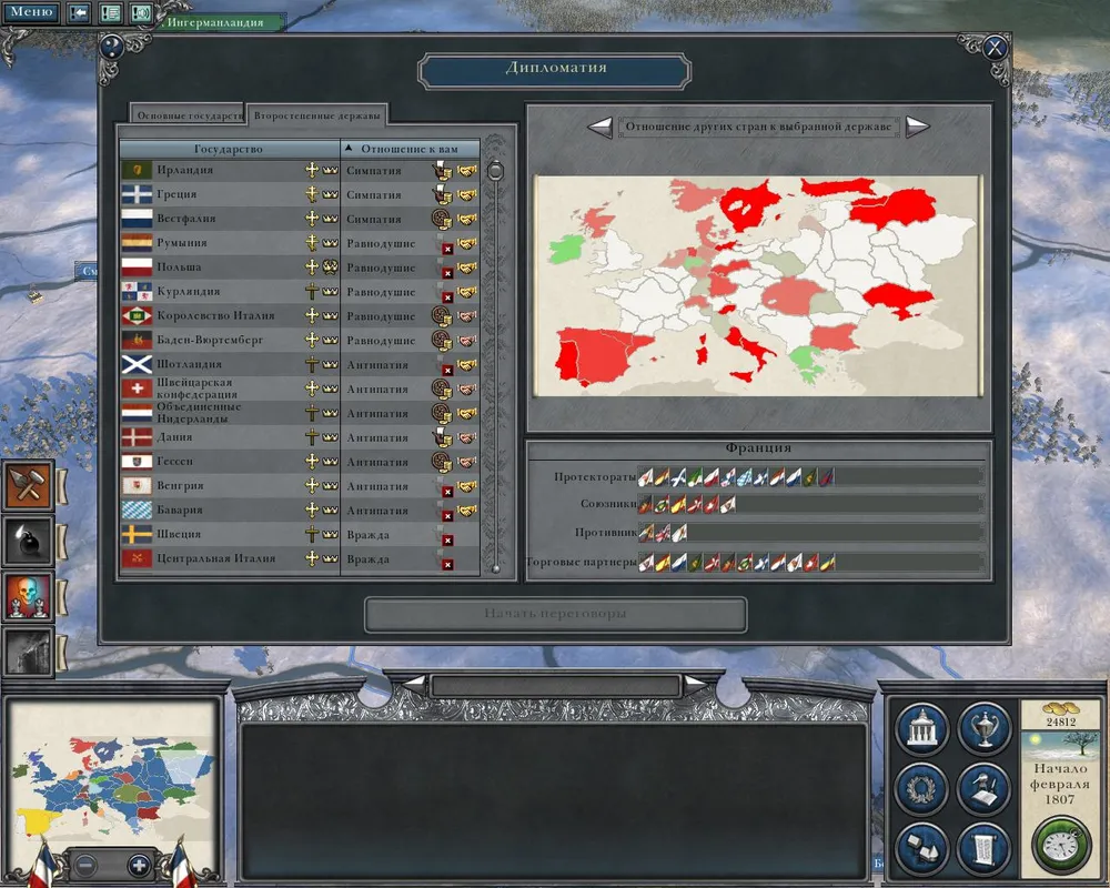 дипломатия наконец-то работает и приносит пользу. 5 союзников - обыденность, 11 протекторатов - вот где сила. это новая суперфича: некоторым захваченным территориям можно дать полунезависимость - будут потом платить оброк и воевать на стороне протектора. я таким образом отгородил Францию от Австрии, Пруссии и России поясом стран-сателлитов и вообще перестал переживать о сухопутных границах. о морских тоже не переживал, потому что еще в 1805-м зашвырнул в Великобританию десант и устроил там расчлененку. теперь на острове - французские провинции Англия и Уэльс + 2 протектората: Шотландия и Ирландия. крупно повезло: сначала флот Нельсона не успел прибыть из Средиземного мо-орька, а потом было уже поздно. если бы успел, утопил бы весь десант.
