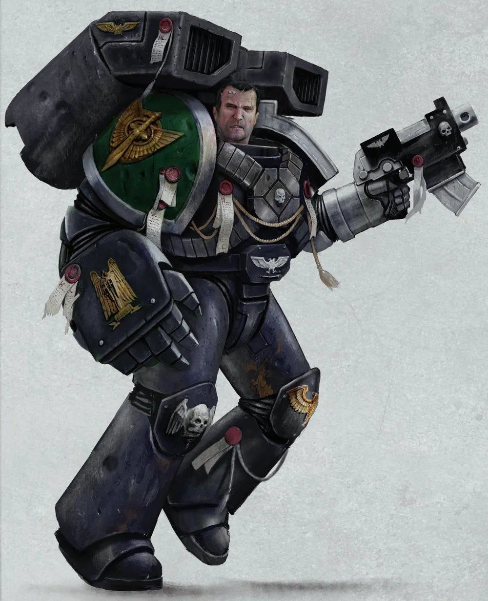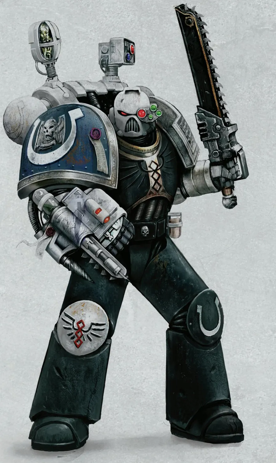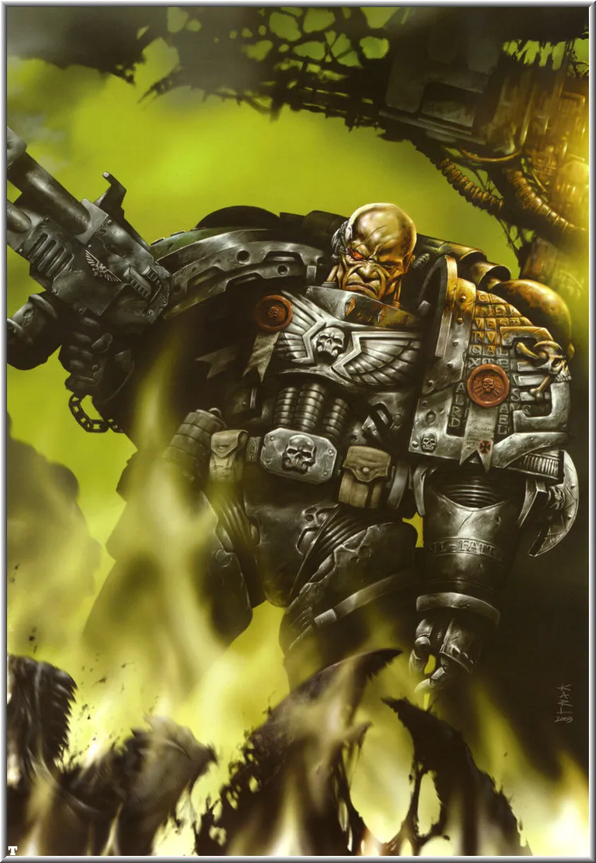 Аугментация в Империи доступна немногим. В число этих счастливчиков входят высшие чины Адептов всех сортов, инквизиторы и космодесантники. Таким образом, как мы видим на данном арте, даже лишившись половины черепа, Караульный Смерти не может рассчитывать на уютный гробик. Космодесантники, способные преодолеть коварство и силу чужаков, слишком ценны для Инквизиции, чтобы скупиться на протезирование.
