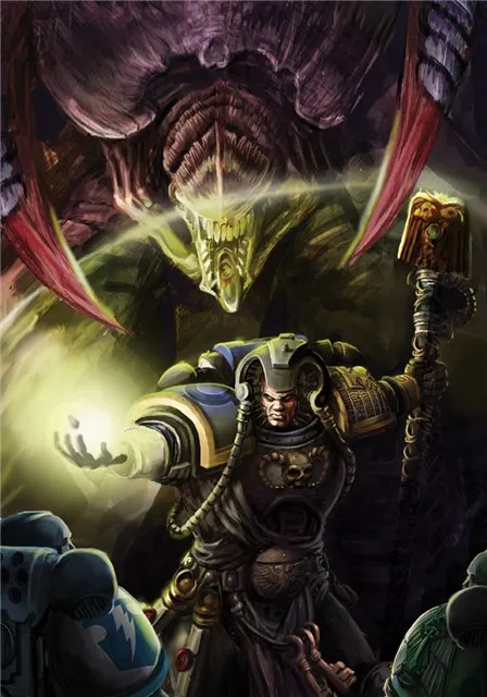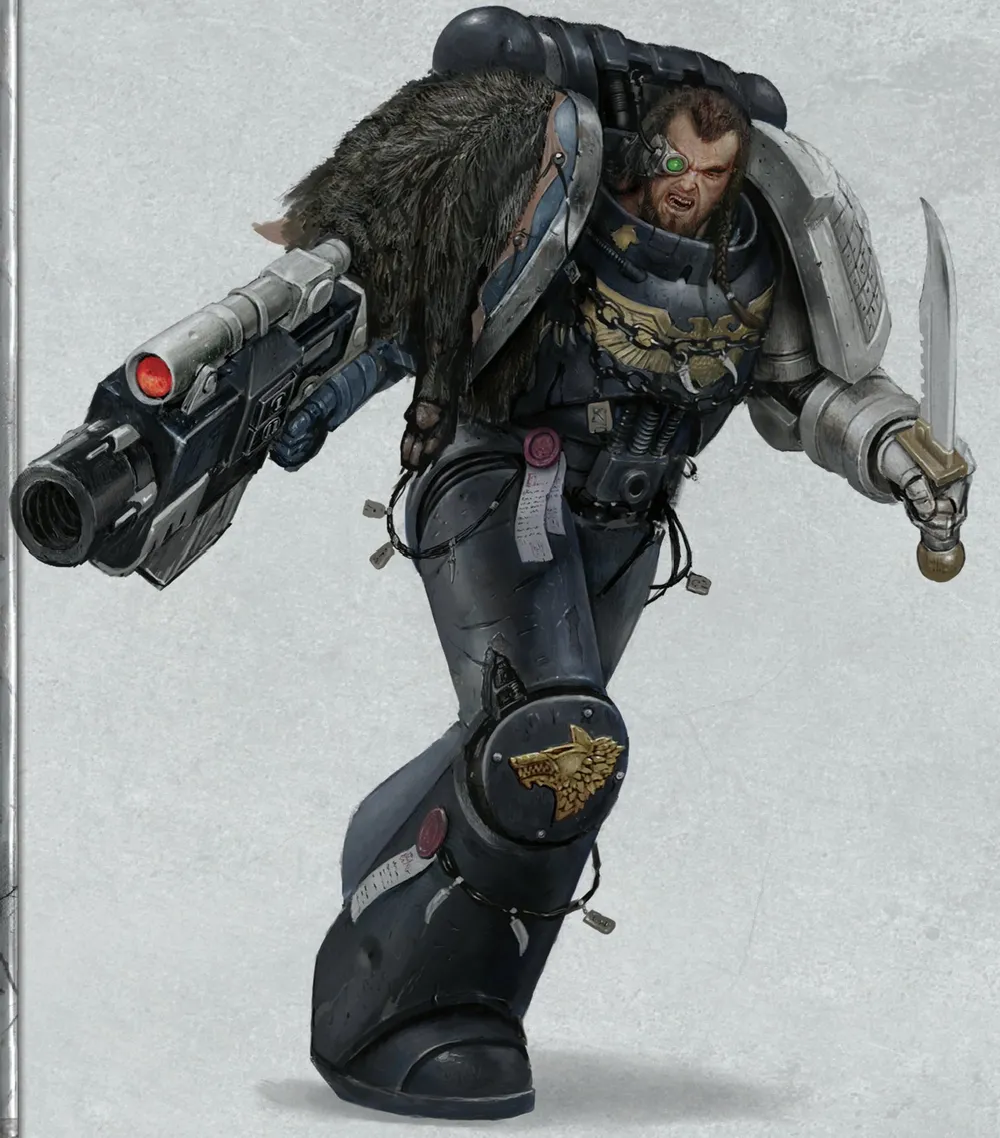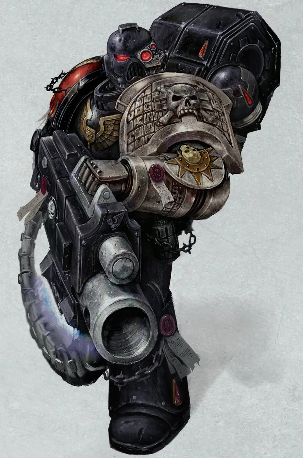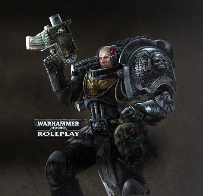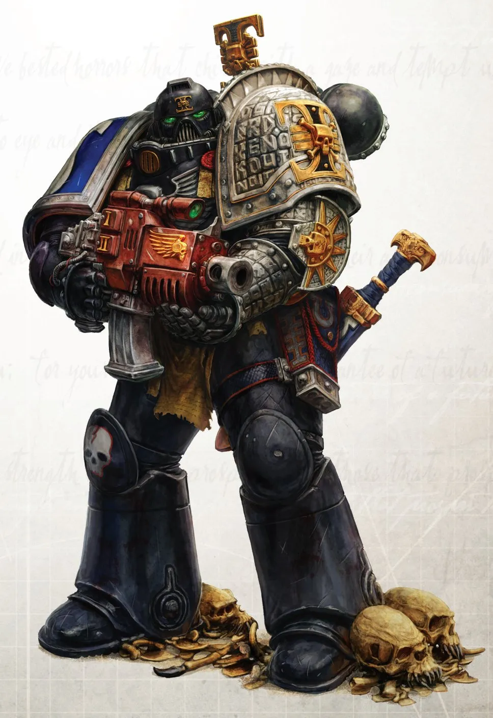 Аугментация в Империи доступна немногим. В число этих счастливчиков входят высшие чины Адептов всех сортов, инквизиторы и космодесантники. Таким образом, как мы видим на данном арте, даже лишившись половины черепа, Караульный Смерти не может рассчитывать на уютный гробик. Космодесантники, способные преодолеть коварство и силу чужаков, слишком ценны для Инквизиции, чтобы скупиться на протезирование.