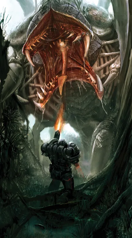 Глядя на данный арт, можно подумать, что опытные Караульные Смерти способны взглядом испепелить тирана улья. К сожалению для них, не способны. Просто им часто выдают знаковое оружие Инквизиции — зажигательное вооружение всех сортов и размеров.