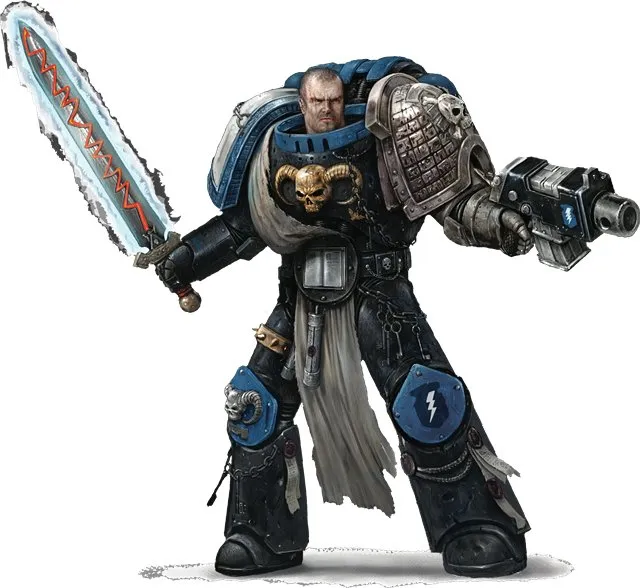 Командование ударными группами Караула Смерти осуществляют капитаны. Этот капитан из Ордена Ультрадесантников. Как можно легко заметить, у капитана количество украшений на доспехе и знаков отличия значительно превышает их же количество на доспехах обычных Караульных. Таким образом, следопыты эльдар радуются и передают привет за отличное выделение командира из толпы хмурых бугаев.