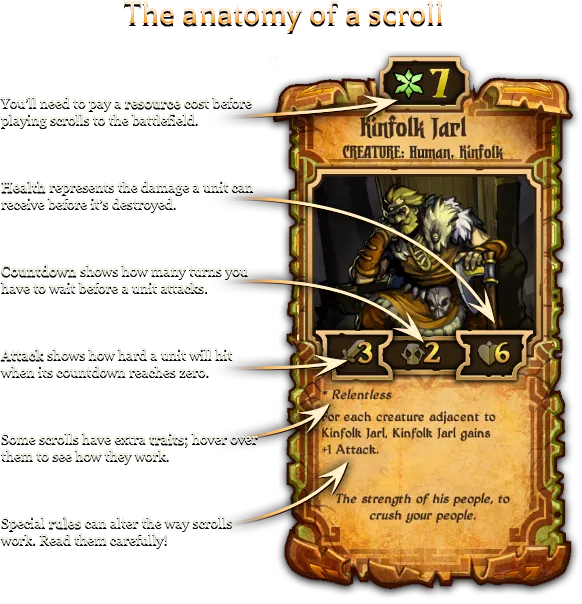 И еще у существ будут свойства — типовые (а-ля first strike) и уникальные (например, свиток Kinfolk Jarl — аналог M:TG-карты Keldon Warlord). Также у существ есть показатель Move (дальность хода) Виды свитков напоминают M:TG’шные — помимо существ есть постоянные enchantments и местные instants (Spells; заклинания мгновенного действия). Специфический для Scrolls тип карт — Structures, которые могут производить ресурсы или бомбить существ противника.