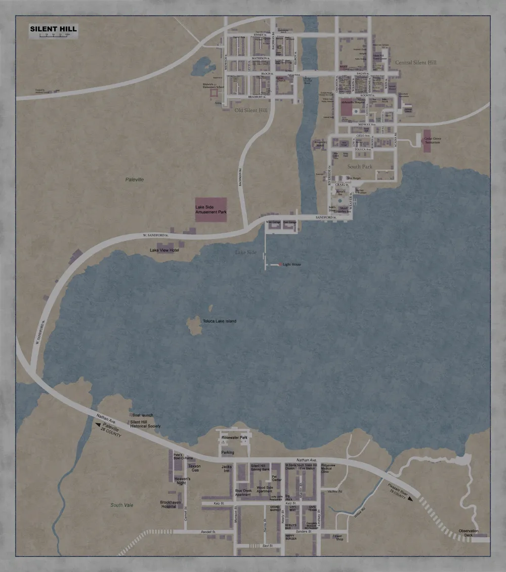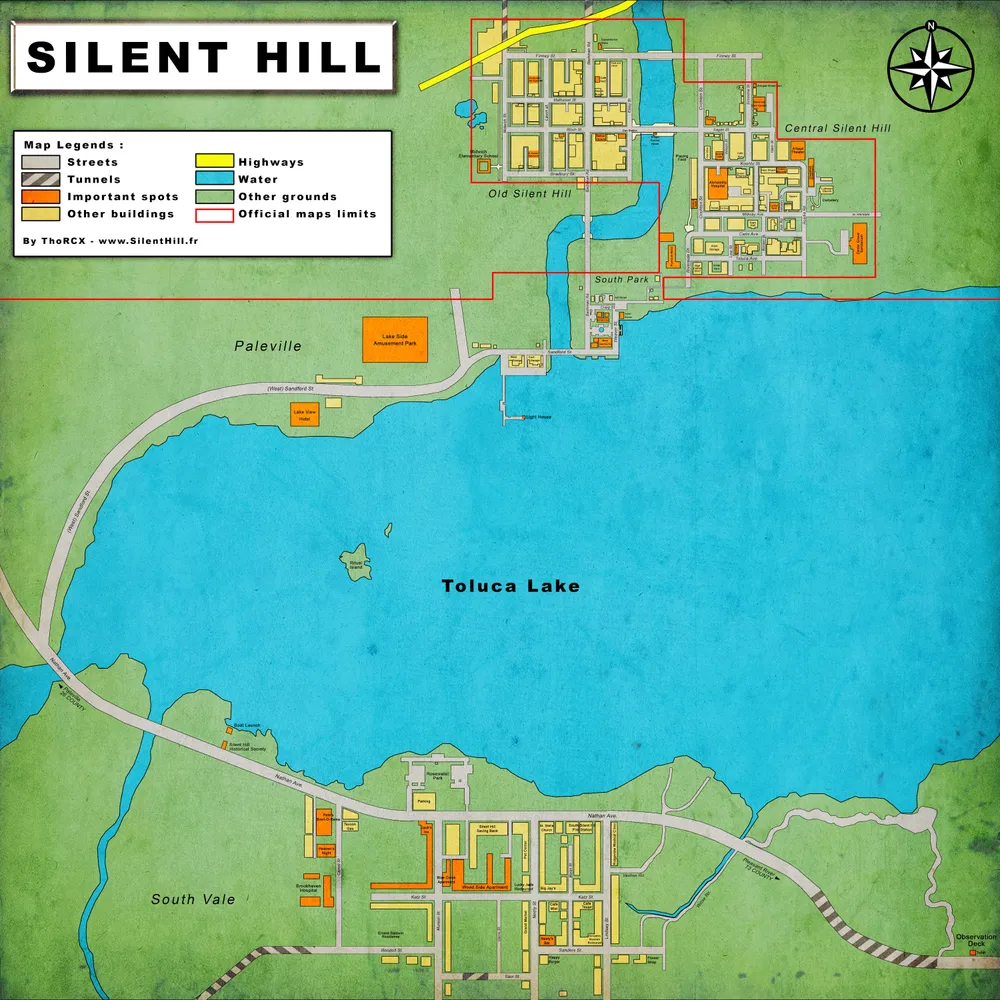 Я всего-лишь хочу поделиться парой карт небезизвестного туманного городка, найденных на просторах Интернета. Советую сверяться при чтении анализа сюжета, начинающим фанатам Silent Hill.