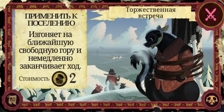 Рекомендации к применению: Если у вас есть немножко золота - обязательно используйте. Отличный способ защитить своё поселение, ведь при провале испытания персонаж мгновенно переносится на гору, не успев отбить поселение у вас. Этой же картой можно, соответственно, изгнать из поселения противника, если использовать не в его ход. Карту также можно эффективно сжечь.