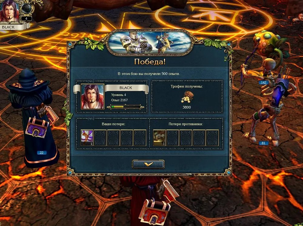 6.26 – 7.37: сильнейший противник с мощнейшим войском. «Последний Герой», «Невидимость» и «Броня Глота» на вампира; враг применяет «Гейзер» - защита выдержала. Второй раунд, ещё один «Гейзер», «Броня Глота» распалась. Дважды «Армагеддон», в третьем раунде – «Ледяная Змея».