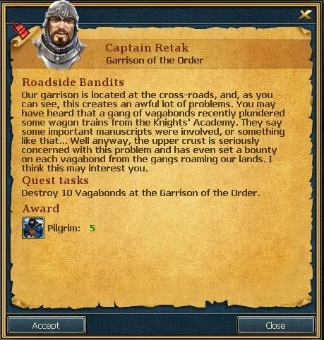 Квесты достаточно просты и скучны: "зачисти n пауков", или "отнеси письмо", но зато хорошо поощряются наградами, особенно это актуально в начале игры, когда у нас еще нет армии, и можно относительно мирным путем получить золота или отряд юнитов.