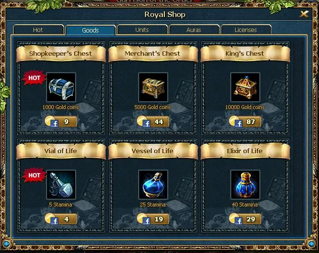 Ненавязчиво нам предлагают приобрести золото, улучшенные отряды, стамину, временные бафы на увеличение лидерства и.т.д. Следует отметить, что это "вымогательство" сделано действительно ненавязчиво, у меня к 10-му уровню ни разу не возникло желания чего-то купить :)