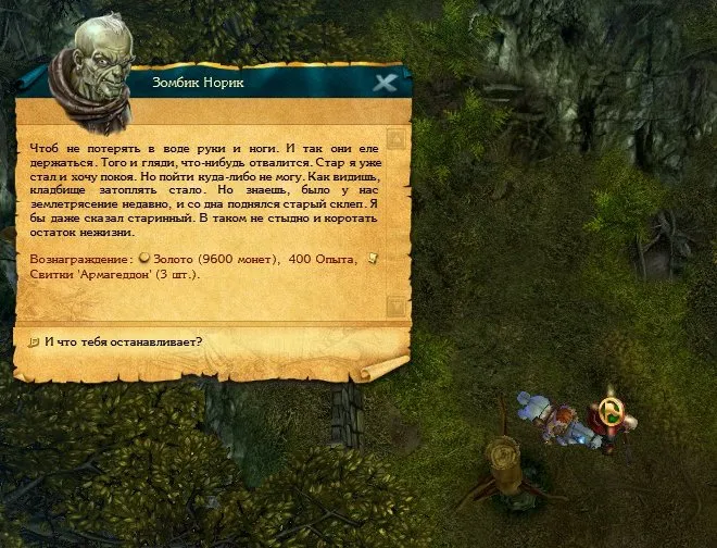 А в топях Зомбик Норик просит очистить находящийся в пределах видимости склеп от конкурентов, и выдаёт за это 400 опыта, золото и три свитка «Армагеддон» (триста тысяч золота, между прочим).