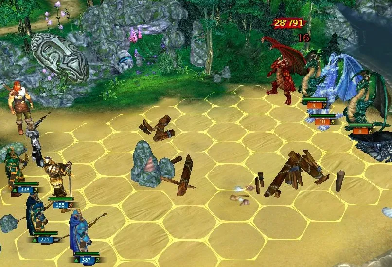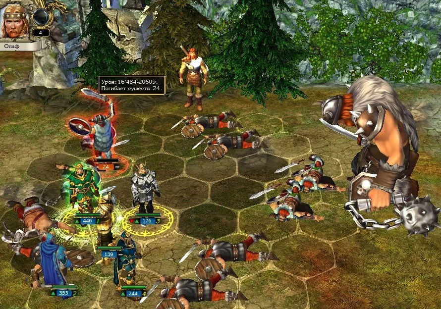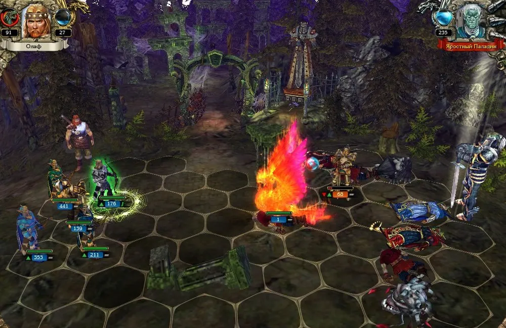 «Точность» даёт усиление атаки всем стрелкам, «Сила дня» - увеличивает атаку по нежити. «Ледяные шипы» задерживают чересчур быстрые отряды врага, «Телепорт» позволяет захватывать сундуки и отодвигать стрелков от врагов ближнего боя. «Одарение» и «Рунное слово» нужны для воскрешения павших лучников паладинами. Все перечисленные заклинания должны быть третьего уровня, кроме одного – «Баран». Бой движется к завершению, а у вас полно погибших? Пускаем пастись один из вражеских отрядов, добиваем остальных и предоставляем паладинам возможность заниматься любимым делом.