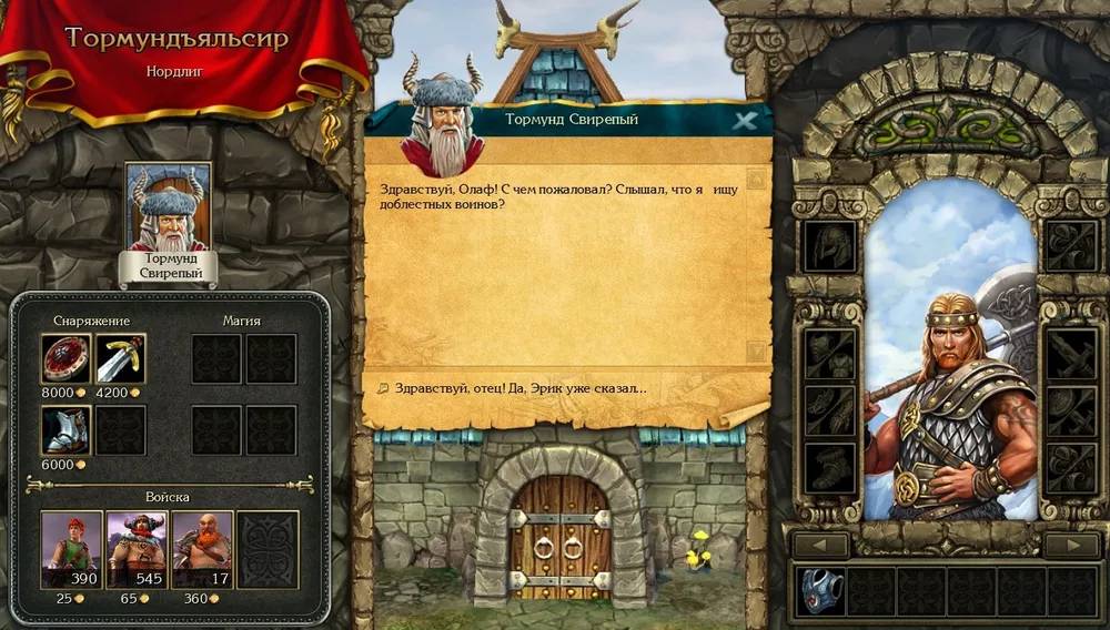 Уничтожаем всё, что мешает. Закупаем войска про запас (воительниц, ярлов и редких бойцов) и сообщаем отцу о победе. В подарок получаем поздравления и очень неплохой молот. (Странно – волхв никогда не получал подобных наград. Должно быть, ярлу больше нравится сын-викинг, чем сын-волхв.)
