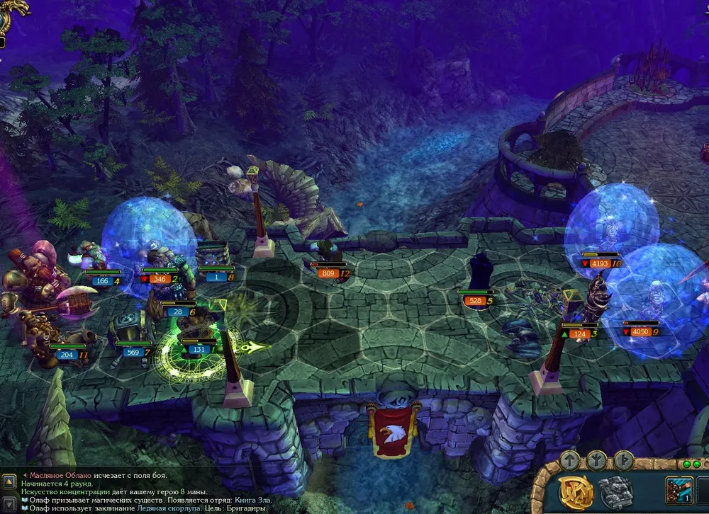 Первым делом уничтожаем некромантов, чтобы не восстанавливали численность войска. Единственный отряд скелетов загоняем в скорлупу, «бараним» пауков свитками, применяем «Воскрешение» на берсеркеров.