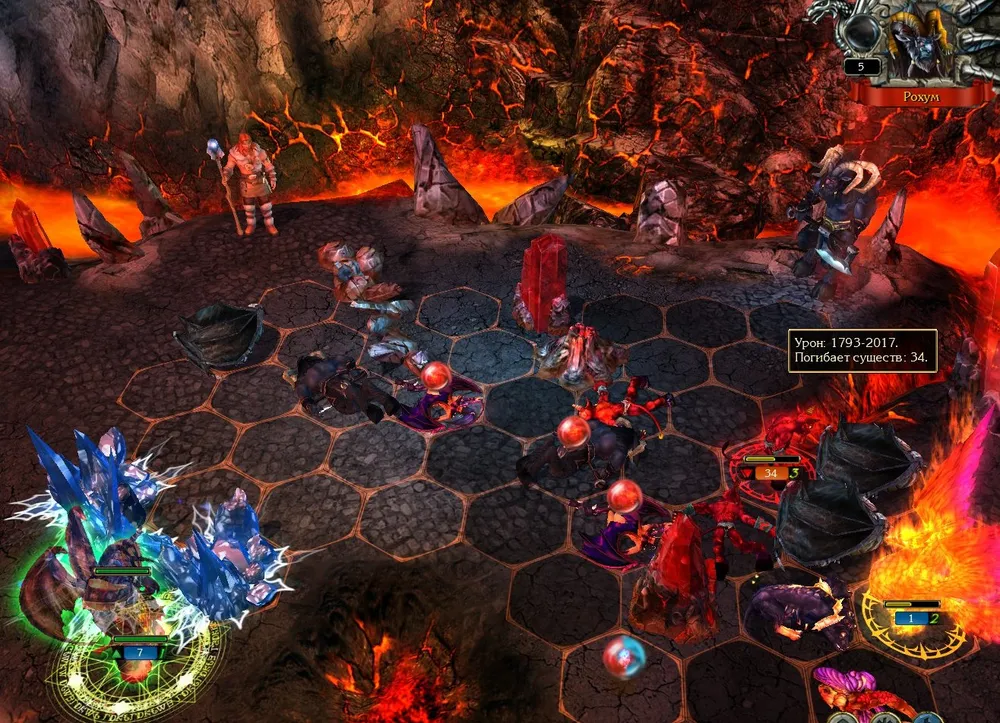 И вот Олаф приблизился ко входу в Пещеру Тайн… Первая атака – Ялассар применяет «Гейзер», все отряды не только получили урон, но ещё и обморозились. Гоботы вносят опустошения в ряды некромантов, горгуаны накладывают «Двойной урон» на северных воительниц, старейшины связывают демонологов «Невидимой связью», советники телепортируются в ряды войска и наносят круговой удар, а тирексы пожирают поверженного феникса. Ничего себе… С первого раунда стало ясно, что этого врага просто так не взять.