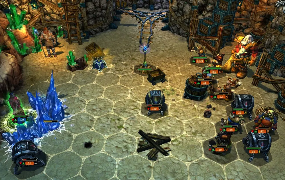 Некромант выстроил гномов монолитным хирдом, чтобы исключить попадание врага в середину войска, прикрыл левый фланг «Ледяными клинками» (обновлявшимися каждый ход) и «Порталом демонов», а правый – ловушкой.