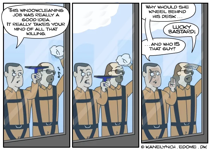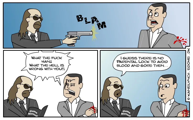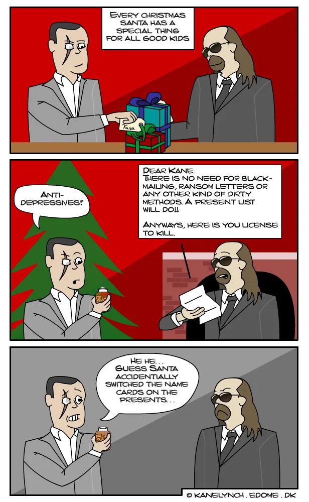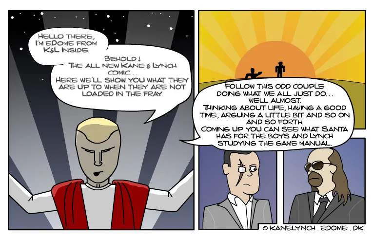 И лишить Вас стимула учить язык?! =) Но если уж совсем туго, то: Комикс 1. Линч: Я тут подумал, если, предположим, я набираю 911, мне надо будет объяснять им как это все случилось? Кейн: Ну, я думаю, им понадобятся какие-то объяснения... Линч: Черт! Кейн: ... И это...кровь на твоем пиджаке?! Линч: Понадоблюсь - я в подвале. Комикс 2. Кейн: Итак, прошел еще один Е3... Линч: О да, чувак, было столько крутых игр: Assassin's Creed, Mass Effect, Killzone 2, Unreal Tournament 3, NFS ProStreet... Кейн: Точняк, и еще никогда не забуду Wii Fitness и SigStar для PS3.. *подходит рабочий и что-то шепчет на ухо Кейну* Кейн: Но самой впечатляющей была игра Kane and Lynch: Deadmen Комикс 3. *Линч стреляет в плечо Кейну* Кейн: КАКОГО Х*Я, ЧУВАК?!!! ЧЕ С ТВОЙ ДОЛБАНОЙ ГОЛОВОЙ?! *Линч открывает мануал к игре* Линч: Знаешь по-моему здесь нет и намека на возможность родительского контроля..и никакой запекшейся крови... Комикс 4. *Кейн зевает* Кейн: Черт, прошлой ночью был реальная жесть. Это мое худшее похмелье... Я просто не понимаю, Линч, по тебе не скажешь, что ты со мной всю ночь бухал. Как у тебя это выходит? *Линч показывает ему свой запас медикаментов ^^* Комикс 4. Линч: Да мы популярнее Бонни и Клайда. Их 2,15 миллиона ссылок против наших 2,29 в поисковике ГУГЛа. В нете стооолько всего полезного! Кейн: ЭТО ТЫ...голый??? Комикс 5. eDome Здравствуй, читатель! Меня величают eDome, один из K'n'L Inside! Будь внимателен, новый комикс уже на подходе. Вам расскажут чем же занимаются великие Кейн и Линч, когда они не заняты в бойне. Они такие же как мы...почти. Размышляют о жизни, хорошо проводят время. Иногда спорят, но с кем не бывает? И даже Санта не пройдет мимо этой милой пары ^^ *Кейн и Линч переглядываються* Комикс 6. У Санты всегда найдется подарок для послушного ребенка. *Кейн открывает свой подарок* Кейн: Антидепрессанты?! *Линч читает письмо от Санты* Линч: "Дорогой Кейн! Нет нужды в шантаже и требовании выкупа. Вместо этих грязных методов просто пришли врагам список желаемых подарков. Как бы то ни было, вот твоя лицензия на убийство." Кейн: Хе, хе... Похоже Санта перепутал наши подарки.. Комикс 7. Кейн: Знаешь, а работа мойщика окон неплохо отвлекает ото всяких мыслей об убийстве... А...а какого черта она делает на коленях под его столом?! Линч: Везучий ублюдок! Кейн: И кто этот парень?!