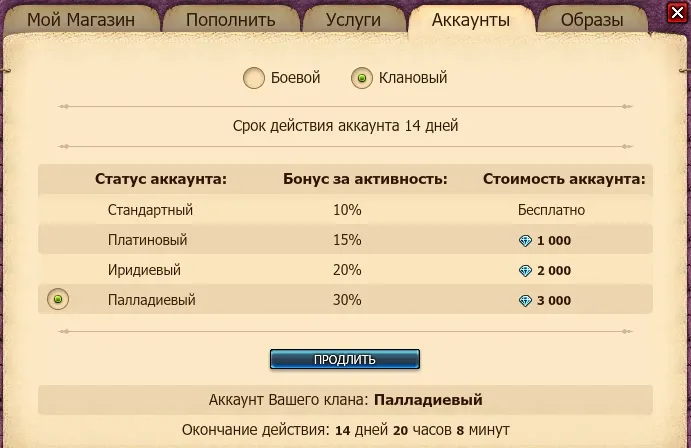 Активация кланового аккаунта доступна только Главе клана. Ресурсы на активацию берутся из клановой казны. Данный аккаунт применяется ко всем текущим игрокам в клане. В случае, если к клану присоединяется новый игрок – аккаунт для него активируется автоматически.
