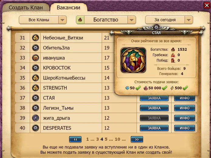Поиск по рейтингам и вакансиям очень неудобен для поиска вакансий в новых кланах, т.к. их там может попросту не быть, но всё же расскажу как действовать: заходите в небесную канцелярию (золотые ворота в левом верхнем углу), там вы увидите две вкладки, в одной вам предложат создать свой клан, в второй находится поиск вакансий, нам во вторую, там вы увидите список кланов, и фильтры для поиска необходимого, такие как настройки по рейтингам, по времени подсчета этих рейтингов, а так же возможность убрать из списка те кланы набор в которые на данный момент закрыт