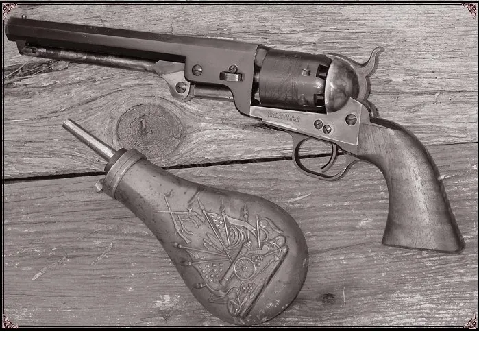 Речь идет, конечно же, о револьвере, запатентованном в 1835 году. Впервые он был опробован американцами в войне против индейцев-семинолов, но настоящее боевое крещение изобретение кольта получило во время Мексиканской кампании. К началу гражданской войны револьверы были уже широко распространены и в ходе конфликта служили в качестве обычного офицерского оружия. Наиболее популярным из них был "Кольт Нэви" (военно-морской) образца 1861 года.