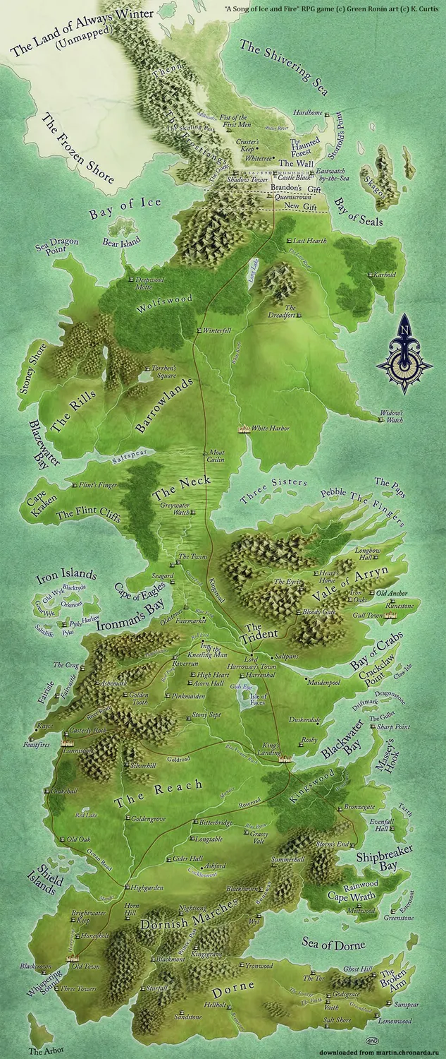 Действие саги происходит на вымышленном континенте под названием Вестерос. Давайте посмотрим на его карту: