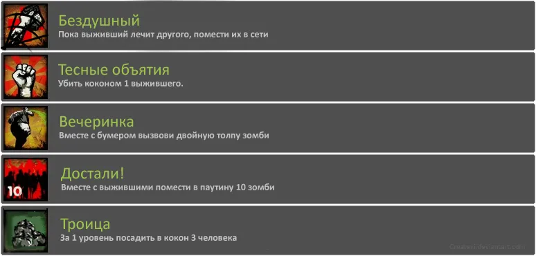 Изначально они кидаются с той поверхности, где находятся, на врага. Левой кнопкой мыши также, как плевальщица, пауки встают на дыбы и кидают сеть. Люди остаются в стоящем положении и могут выбраться с помощью холодного оружия, но это их задерживает на месте минимум на 5 секунд. В это время, на выживших, попавших в сеть бегут толпы зараженных, как если бы толстяк их оплевал.