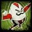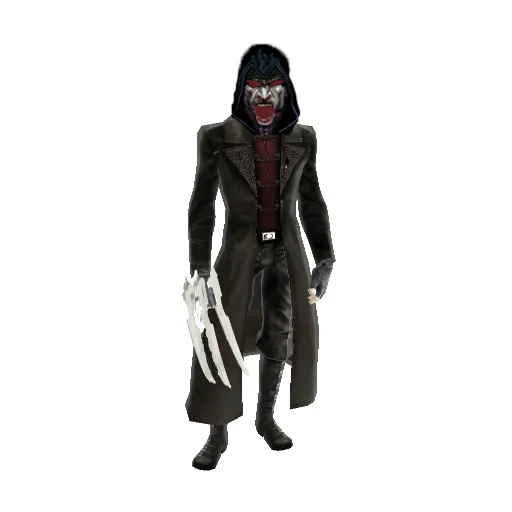 На нём чёрный плащ. Из глаз, ноздрей и рта виден красный свет имплантата. Одна ладонь обрезана. Вместо неё стоят ножи. Другая на месте. Ментал её использует для направления силы.
