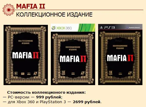 Стоимость коллекционного издания Mafia IIдля PC составит 999 рублей, для Xbox 360 и PlayStation 3 — 2699 рублей.