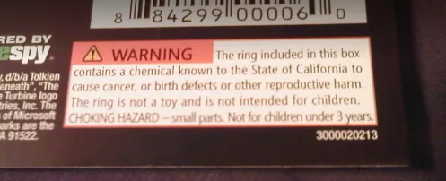 Кольцо, вложенное в эту коробку содержит химикаты, известные в штате Калифорния как вызывающие рак, или наносящие вред системе деторождения и другим репродуктивным функциям. Кольцо не игрушка (а средство биологической атаки - прим. переводчика) и не предназначено для детей. УГРОЗА ШОКА - содержит мелкие части. Не для детей младше 3х лет.