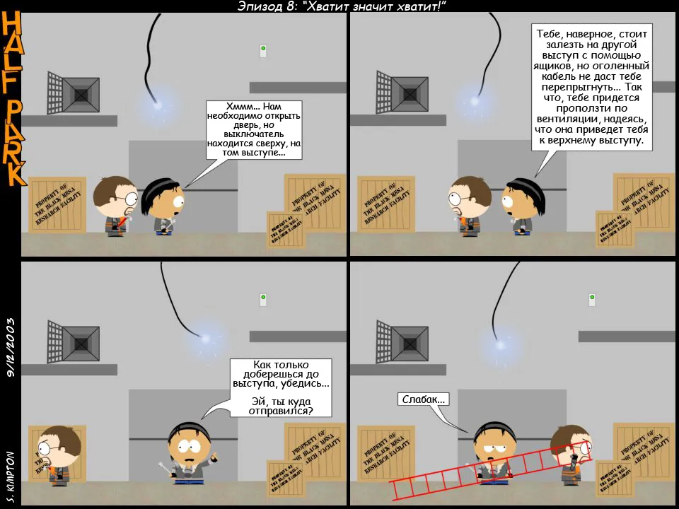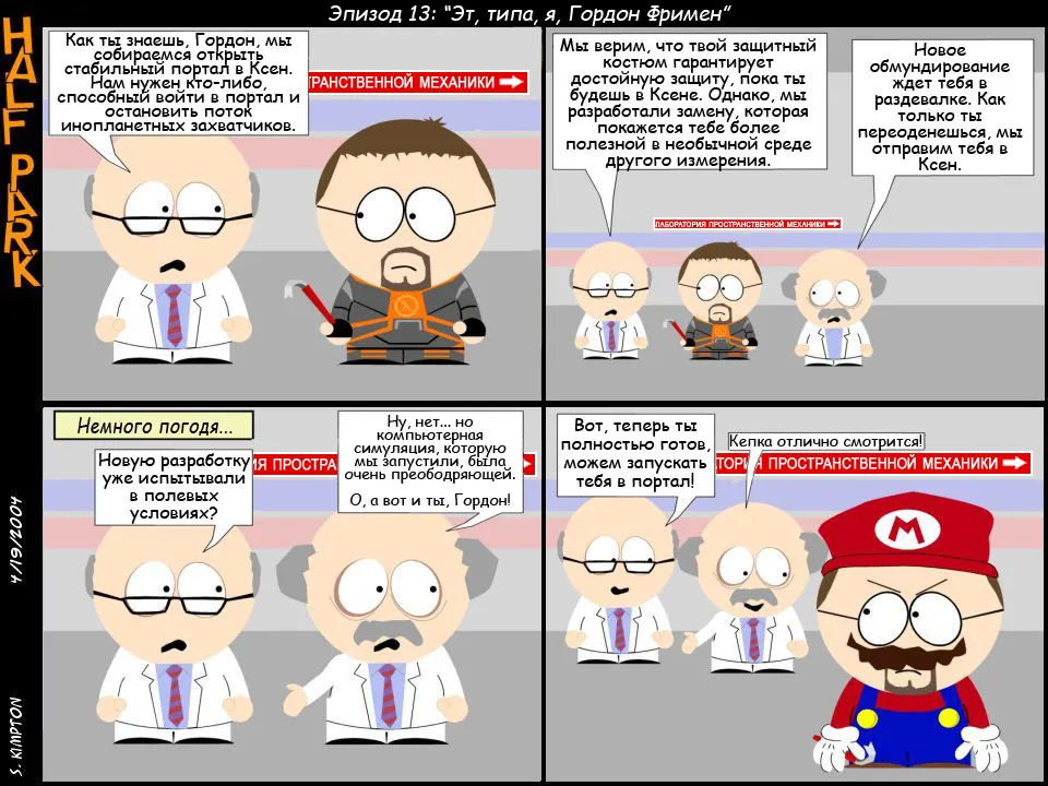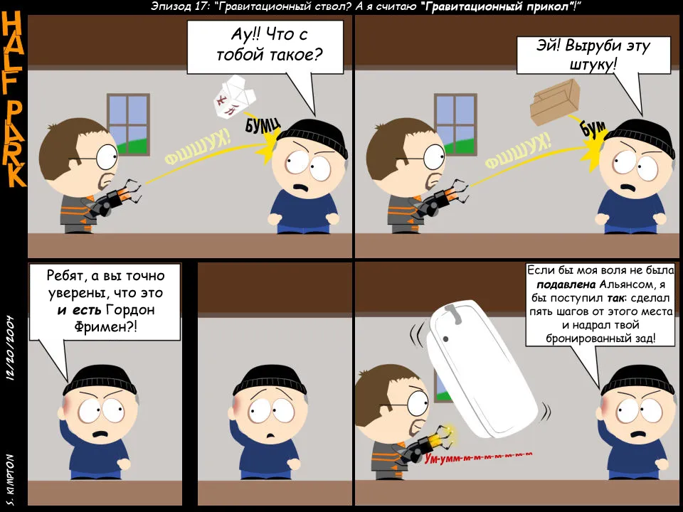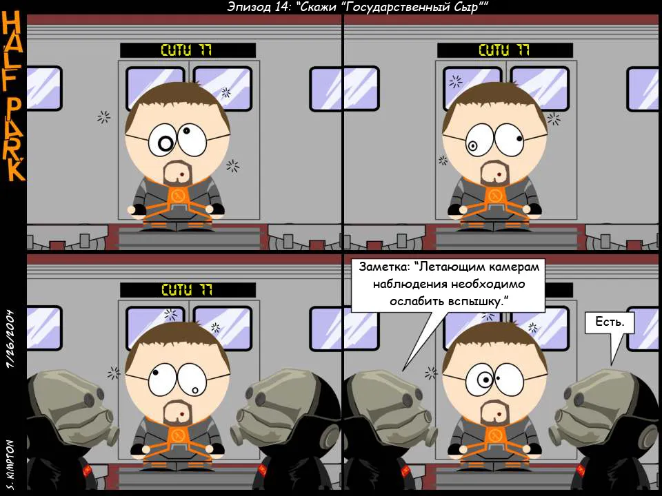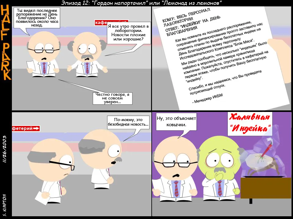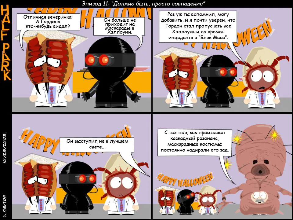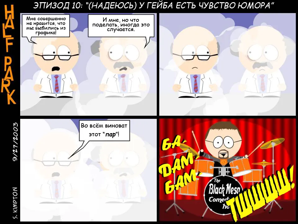Я поискал, и вроде здесь эта минисерия не упоминалась. Так вот, позвольте представить вам небольшую комикс-серию Half-Park. В комиксе показаны небольшие сценки, связанные со вселенной HL, нарисованные в стиле Южного парка. Комикс рисовался с E3 2003 года до выхода игры в 2004, поэтому обыгрывает анонсы, проходившую информацию, отсрочку игру и немного геймплея. К сожалению, он включает всего 18 листов. Увы, автор это дело бросил.