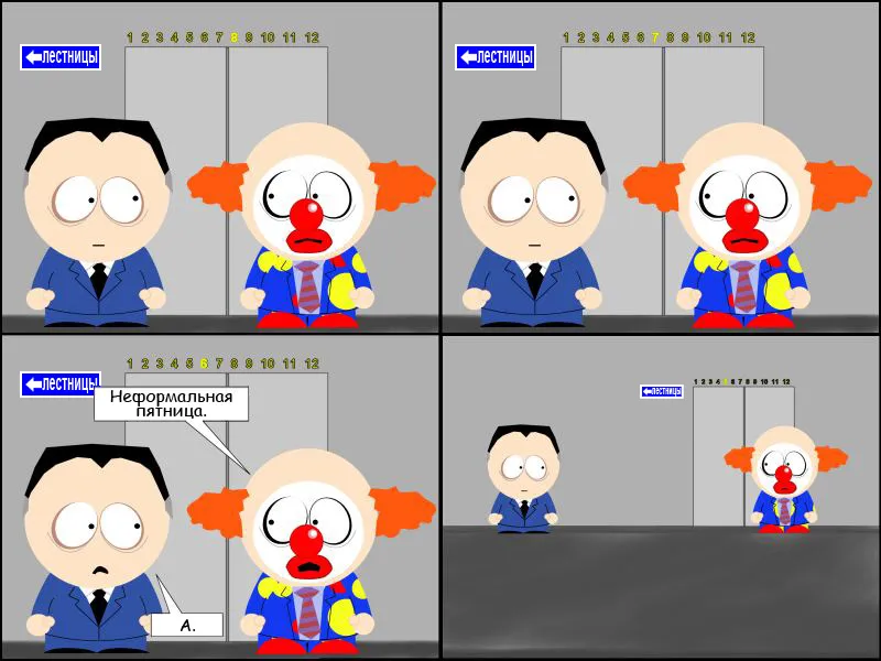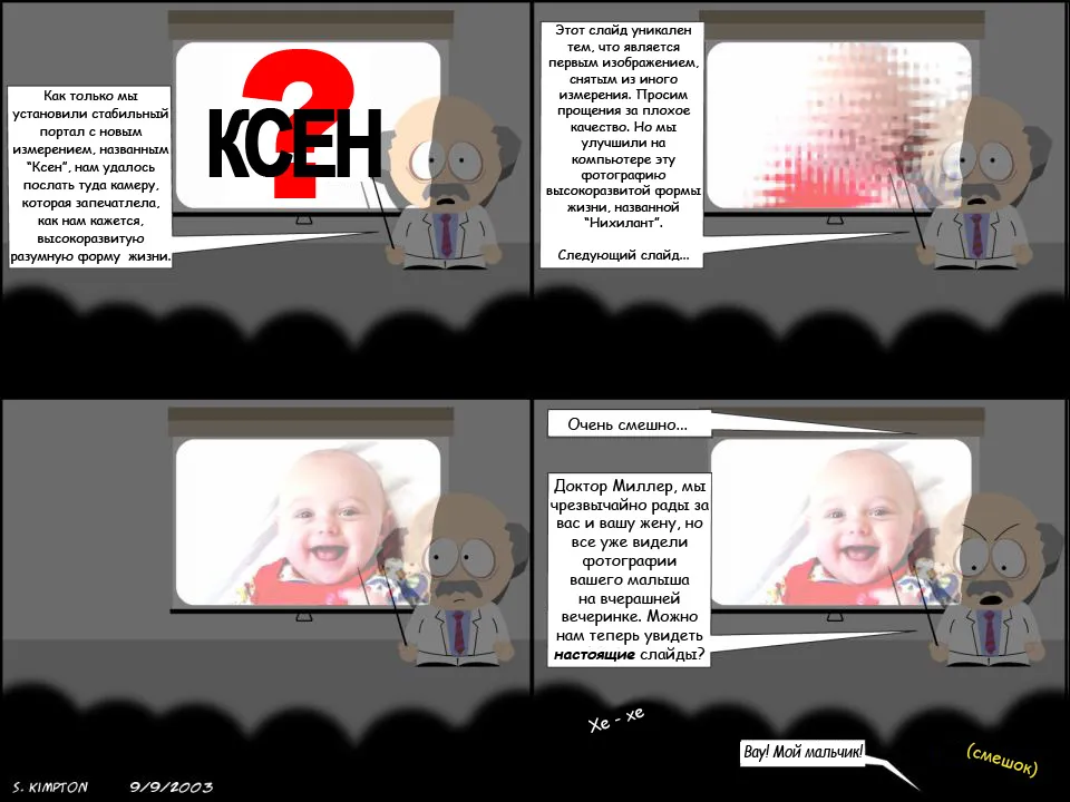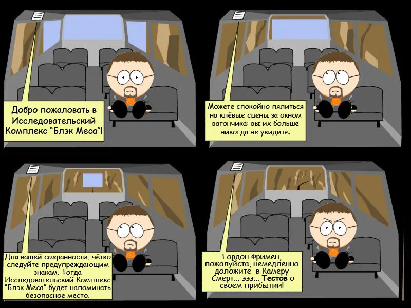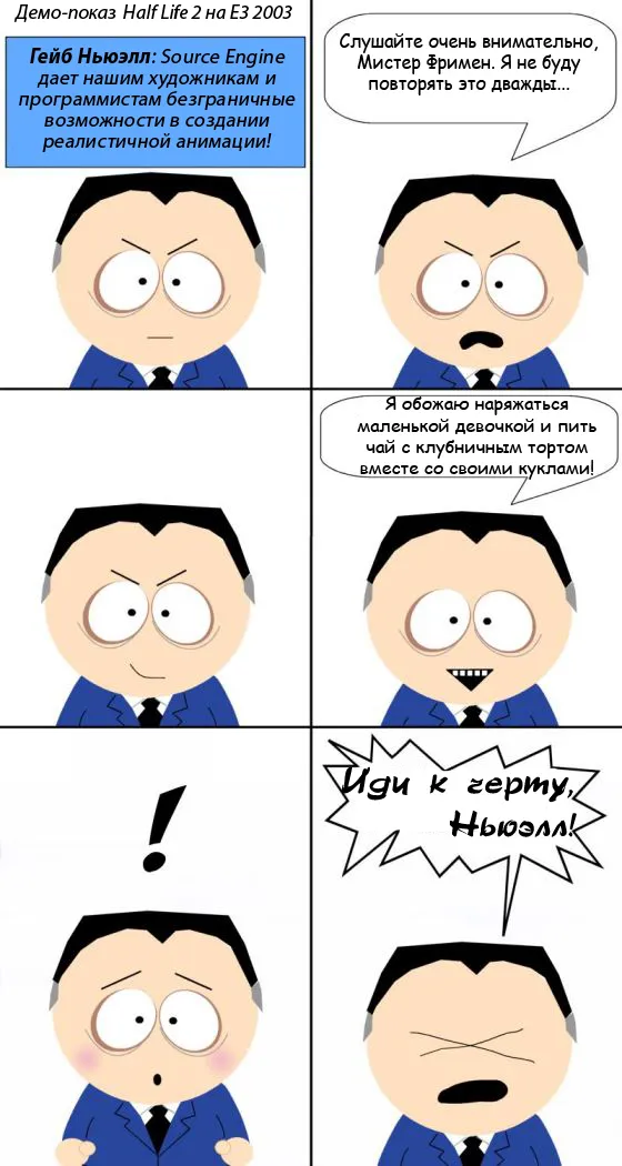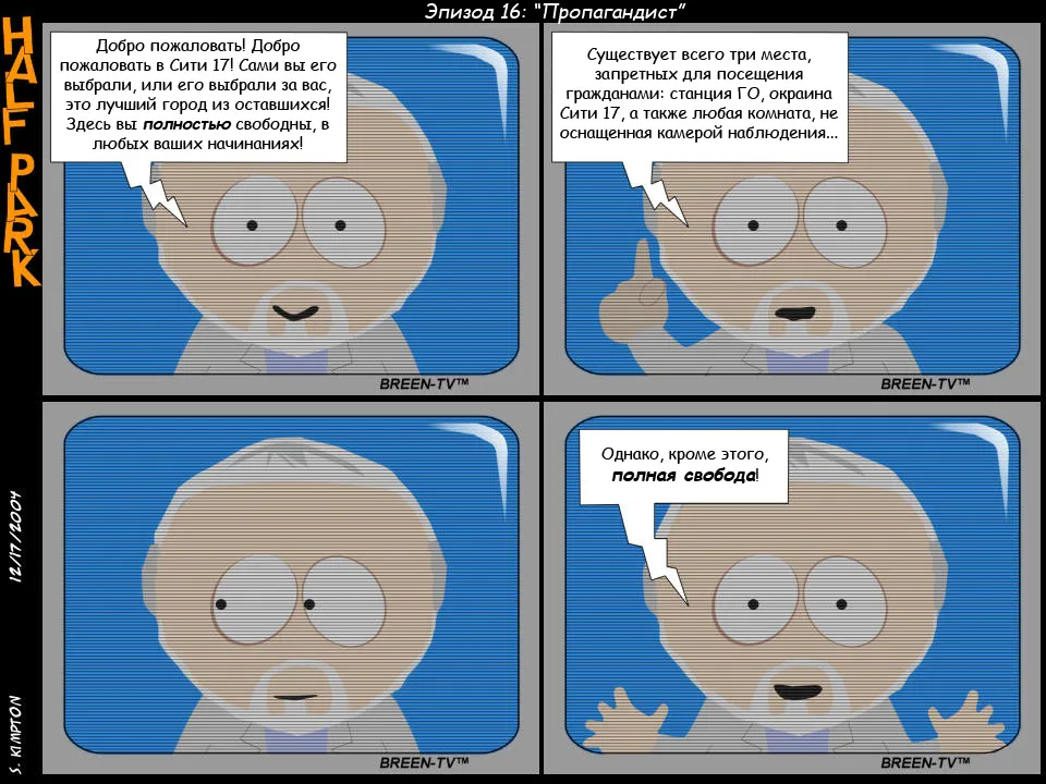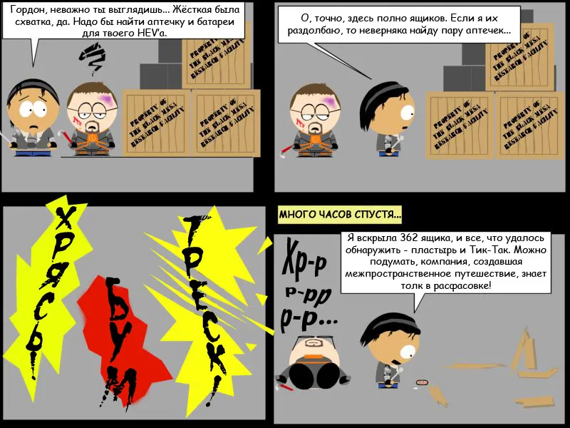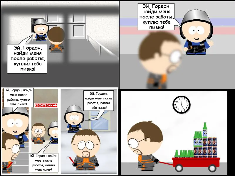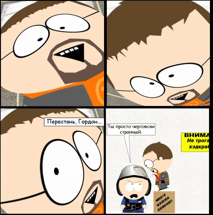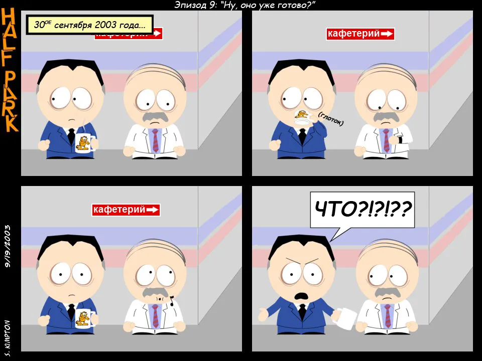 Я поискал, и вроде здесь эта минисерия не упоминалась. Так вот, позвольте представить вам небольшую комикс-серию Half-Park. В комиксе показаны небольшие сценки, связанные со вселенной HL, нарисованные в стиле Южного парка. Комикс рисовался с E3 2003 года до выхода игры в 2004, поэтому обыгрывает анонсы, проходившую информацию, отсрочку игру и немного геймплея. К сожалению, он включает всего 18 листов. Увы, автор это дело бросил.