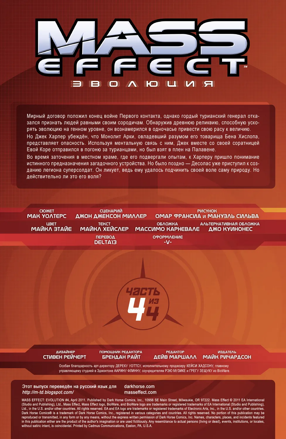 Десолас и Сарен приступили к созданию легиона суперсолдат, не подозревая, что монолит таит опасность не только для человечества и других врагов турианцев, но и для них самих. Каково же его истинное предназначение? Именно это выясняет будущий Призрак Джек Харпер в четвёртом выпуске новой комикс-серии по мотивам трилогии Mass Effect. Перевод команды MT-D