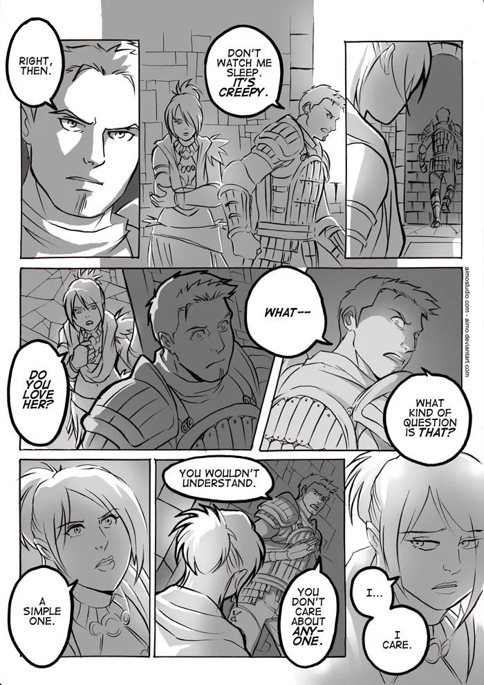 Действующими лицами комикса являются Алистер и Морриган. Очевидно, этот разговор предшествует предложению Морриган о зачатии ребенка от Архидемона.