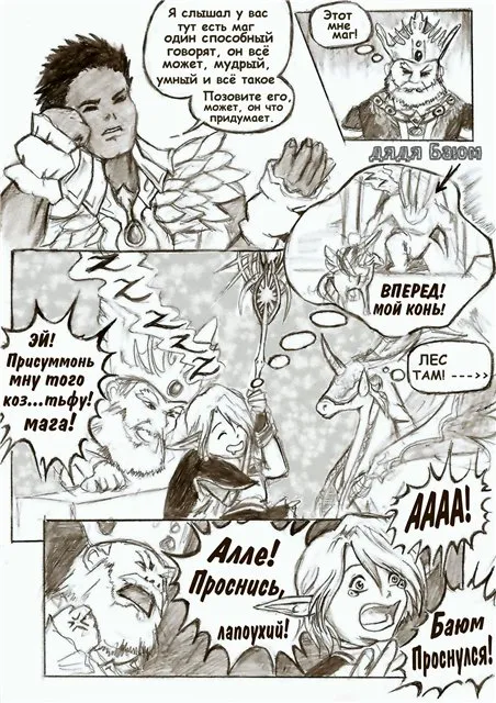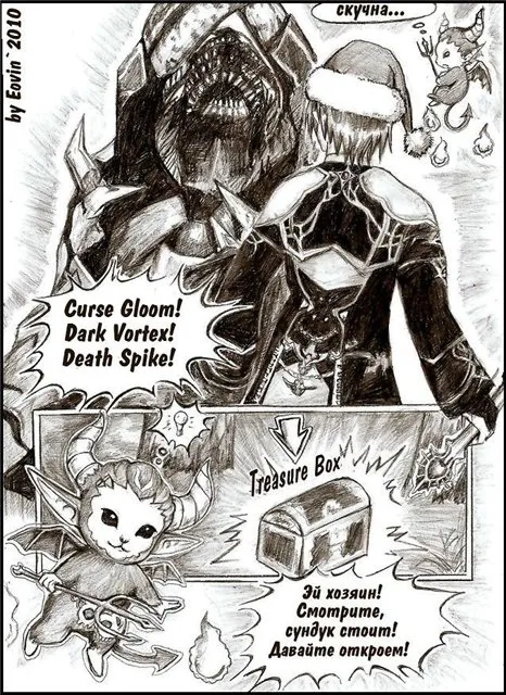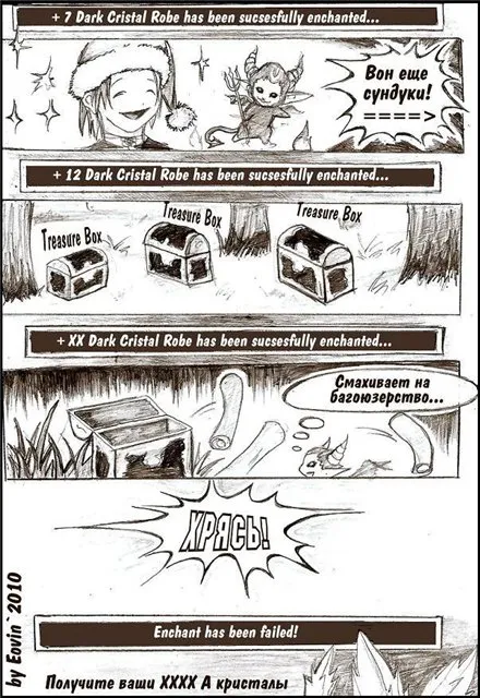 Недавно, путешествуя по просторам форумов разнообразных бесплатных серверов Lineage II, я натолкнулся на прелюбопытнейшие фан-комиксы, созданные Eovin, игроком комплекса серверов Schock-World (это не реклама, я лишь указываю доступные мне реквизиты автора работ. По причине долгого отсутствия автора в онлайне, я не смог спросить разрешения на публикацию работ, но, поскольку они находятся в свободном доступе на одном из бесплатных хостингов изображения, это можно считать косвенным разрешением)