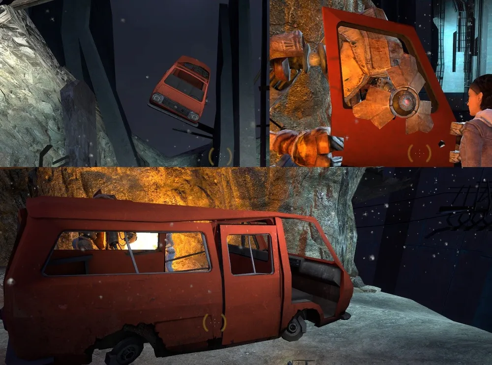 Билл Ван Бюрен: Сюжет игр прорабатывают группы дизайнеров, которых мы зовем «интриганами». Когда на одном из их собраний возникла идея посадить Аликс и Гордона в фургон, который Пес затем перекинет в Цитадель, мы посмеялись – и перешли к более серьёзным идеям. Но по мере работы над игрой мы всё чаще и чаще возвращались к этой задумке – и в конце концов решили, что стоит попробовать. Несмотря на то, что сама по себе идея казалась диковатой, она отвечала нашим основным задачам: переправить Аликс и Гордона на ту сторону, отвести Псу главную роль и объяснить, почему он не идёт с ними. Нам оставалось решить несколько технических проблем: совместить фургон с анимированными моделями; убедиться в том, что фургон не задавит игрока; наконец, объяснить мысли Пса, который пробует бросать обломки в Цитадель, прежде чем решается преподнести свой план Аликс. В конце концов нам удавалось создать сцену, которая решала проблемы гейм-дизайна, отражала нежную дружбу между Аликс и Псом и позволяла попасть в Цитадель необычным и оригинальным способом.