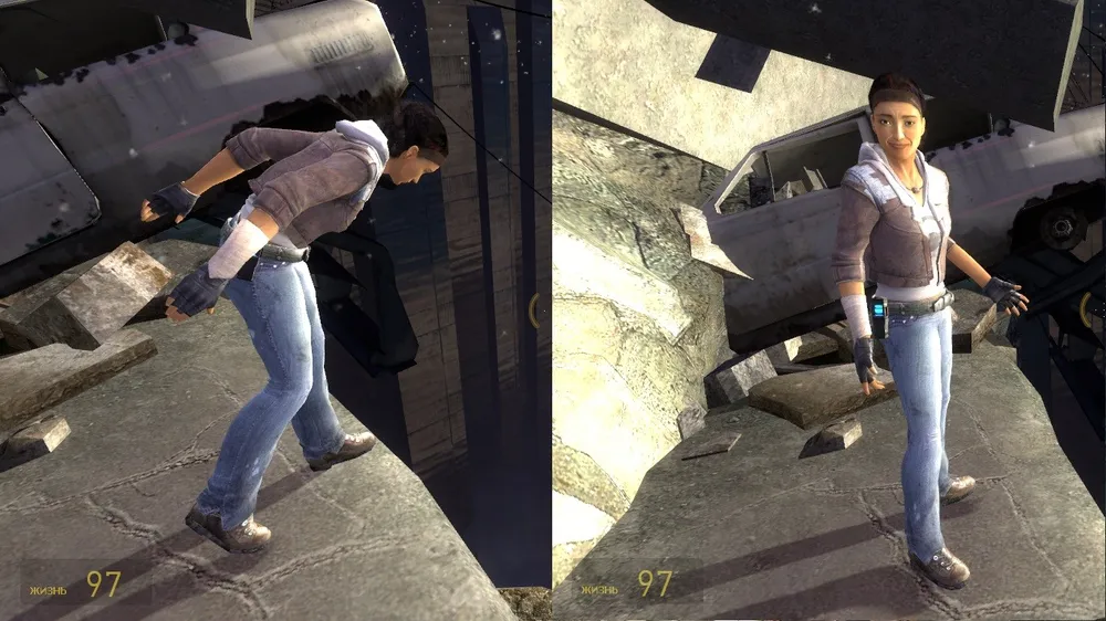 Джейсон Митчелл: Аликс часто перемещается по игровому пространству первого эпизода вместе с игроком и проходит через значительно большее, нежели в Half-Life 2, количество типов освещения. Нам пришлось улучшить алгоритмы освещения для Аликс, чтобы её модель выглядела реалистично в любом пространстве – от зловещих коридоров Цитадели до улиц Сити-17 в лучах заката. Мы добавили к шейдерам модели спекулярное освещение, благодаря чему кожа, куртка и даже зубы Аликс стали реалистично отблескивать. Мы сделали особенный упор на яркие световые пятна, появляющиеся при расположении источников света по касательной. Этот тип освещения, называемый источником освещения, производит особенный эффект в том случае, если источник находится под низким углом к модели – например, яркий закат. Источник освещения усилен высокодинамической пост-обработкой, которая позволяет размывать световые пятна, добиваясь удивительного по силе эффекта. Мы осознали, что работа с цепью эпизодов позволит нам не отставать от прогресса и постоянно добавлять в движок Source новые технологии – такие, как эта технология освещения.