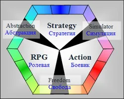 Вообще различают три основные группы компьютерных игр: стратегии, ролевые игры, боевики. Здесь игры расквалифицированы на 15 элементарных составляющих (5х3). Любая игра поддается классификации по этой системе.