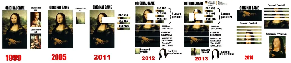 В какой-то мере моду клепать из частей игры отдельные длс, и потом продавать их отдельно от игры высмеивает игра DLC Quest.