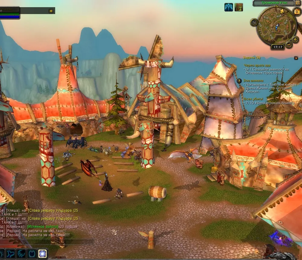 Лавки торговцев оружием,разнообразными побрякушками кругом шли по уступу.Огромные вековые ели конкурировали своими размерами с тотемами,находящимися на разных участках уступа.Около озера разместились кузнецы,постоянный звон молота о наковальню то и дело резал слух.Здесь же невдалеке располагалась доска приказов,дабы все были в курсе последних событий.Огромный гильдийский тотем стоял невдалеке от нее.Юго-западный подъемник вел на южную дорогу ,проходящую через самое сердце Мулгора.