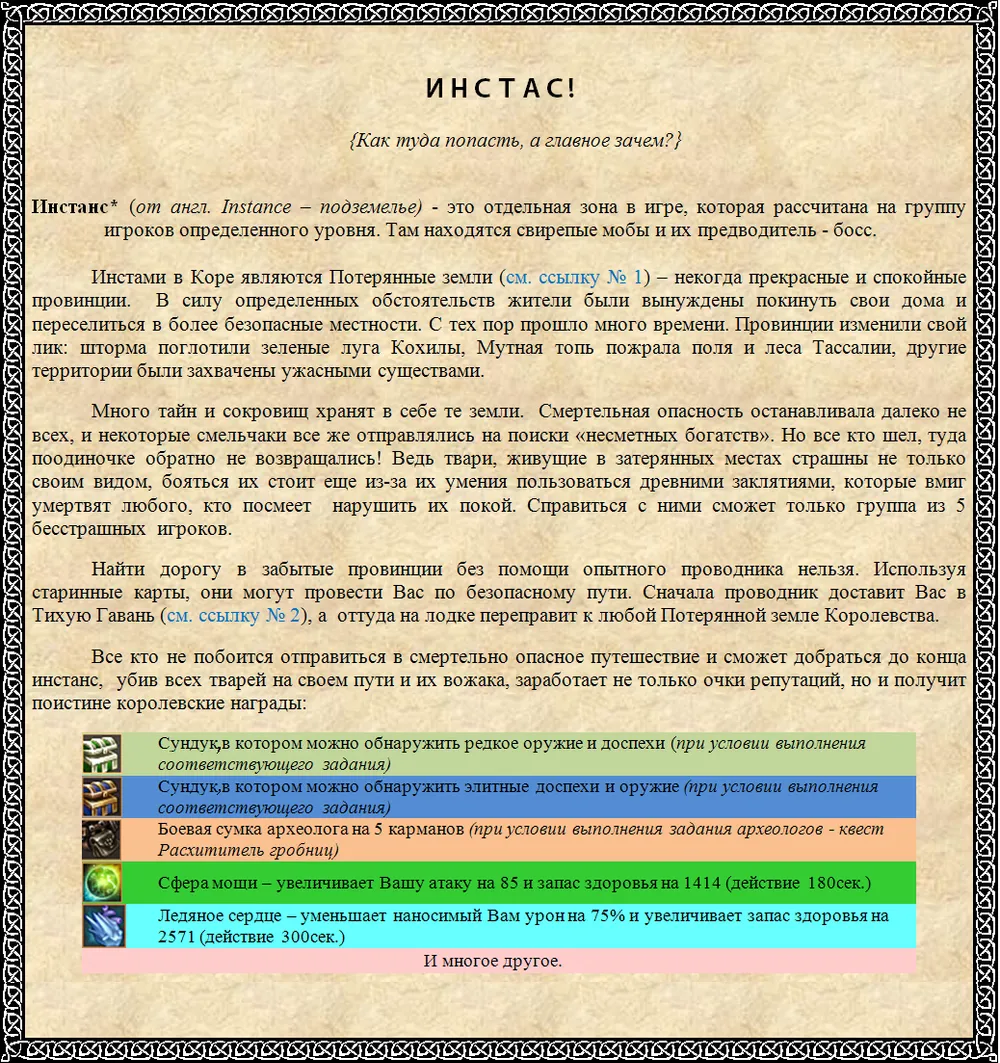 Ответ нашелся сам: «Что такое инстанс» - прозвучал вопрос в игре несколько раз за вечер, и я вспомнила, что он звучал и раньше. Вот с этого я и начала. Затем мне захотелось перечислить все Потерянные земли и понеслось. … Особенного вроде бы ничего и не сделала, но масштаб проекта оказался ужасно громадным. Сейчас я смогла описать лишь «Потерянные отмели», поскольку больше нигде и не была, но останавливаться на этом как-то не хочется. И я решила, что доделаю этот справочник до конца! Когда это будет, я не знаю, но знаю точно что не отступлю!