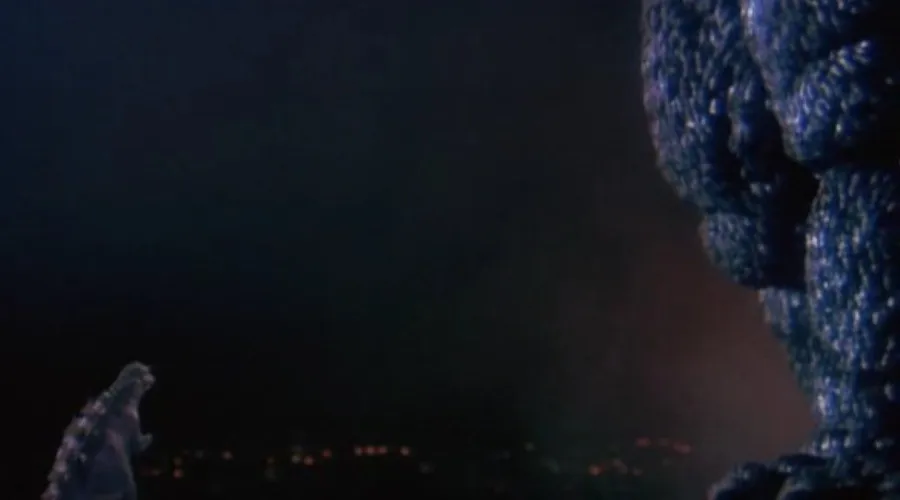 Мини-Годзилла вышел на открытую местность, впереди него бушевало гигантское чудовище. Тут взгляд монстра упал на человека в костюме. Огромный исполин издал протяжной рык и стал медленно приближаться к своей маленькой копии.