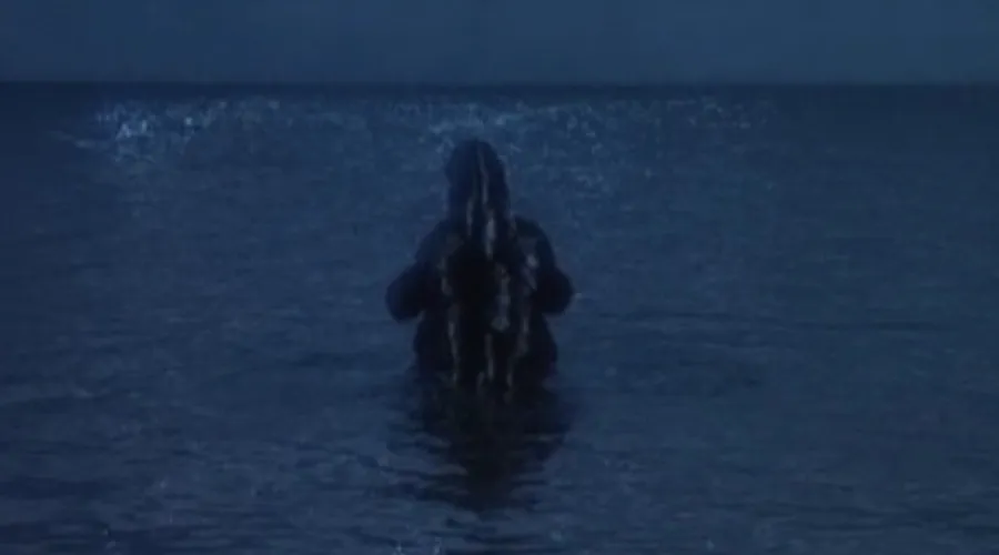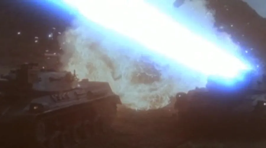 Как только режиссер произнес эти слова, монстр раскрыл пасть и выпустил огромный синий луч по находившийся в 400 метрах от него танкам. В один миг танки были сметены потоком невероятной энергии. Монстр, не прекращая испускать луч, направил его по дуге в сторону съемочной группы.