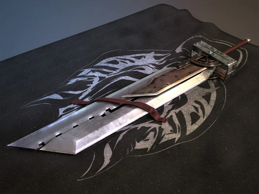 ... получивший так же название First Sword от Tetsuya Nomura, выглядит как увеличенный в размерах двуручный меч, который, несмотря на размеры и массу, Клауд носит исключительно в одной лишь правой руке. Меч состоит из длинной рукояти, обернутой в красный материал, огромной гарды, в которой закрепляются остальные мечи, и длинного лезвия, которое в начале, примерно на длину рукояти, более широкое, чем остальная его часть. Это единственный обоюдоострый меч в наборе.