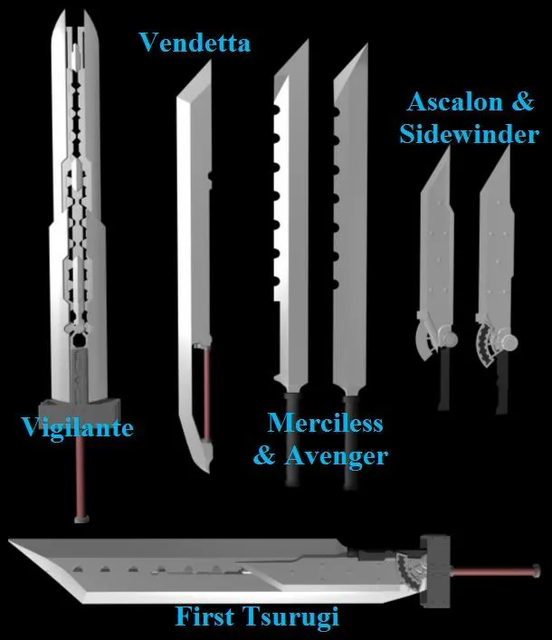 От себя добавлю, что в этом досье я буду использовать как фанатские, так и названия, данные мечам создателями. То есть если я пишу First Tsurugi или Fusion Sword(s) то имею в виду мечи в собранном либо частично собранном виде, если пишу First Sword – имею в виду только основной меч. Так же перечислю вам фанатские названия всех клинков: Vigilante – основной длинный меч, Vendetta – пустой внутри V-образный меч, Merciless и Avenger – задние мечи, Ascalon и Sidewinder – короткие боковые мечи, First Tsurugi –собранные воедино все шесть клинков.