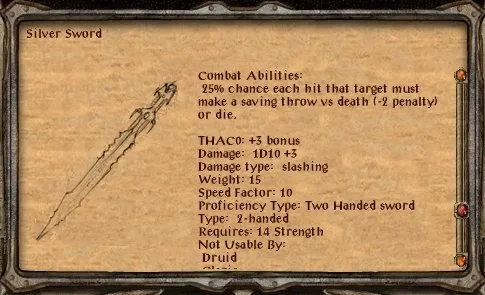 В "Baldur`s Gate II" существует множество секретных артефактов, которые могут быть выкованы дварфом Кромвелем, если группа сможет найти необходимые компоненты. Хотя серебряный меч и не наносит больших повреждений, как другие артефакты, его стрижающая способность мгновенно убивать врагов делает его незаменимым оружием для воина в вашей группе.