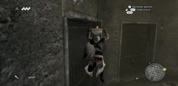 Дезмонд видит призраки Эцио и людей, покидающих стены виллы. Сворачивать некуда, так что бежим вперед, прыгая по стенам. По пути используем подсвеченные рычаги. Нам встречается новое (по сравнению со второй частью) очень забавное приспособление – средневековый лифт. Подсаживаем на себе Люси. Мы его правда уже встречали, когда Эцио помогал оборонять родной дом от нападения, но вряд ли в бою успели заметить что это, и в полной мере насладиться девайсом. Впереди разрушенный мост и на другую сторону не допрыгнуть. Люси прыгает через голову Деза, опускает одну из перекладин, куда мы и сможем долететь. Если упадете, всегда можно вернуться к исходной точке – тупиков в игре нет.