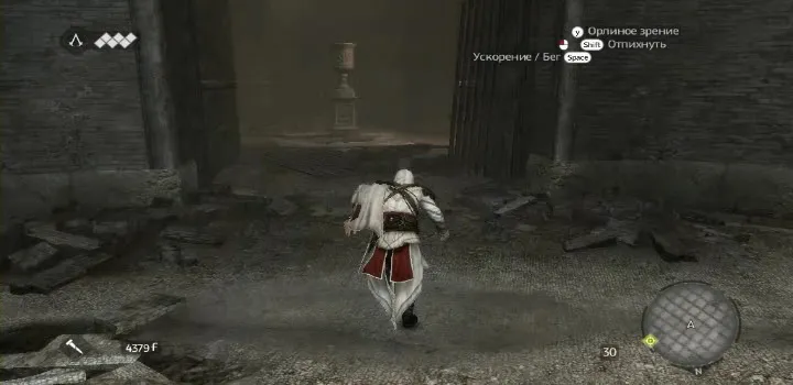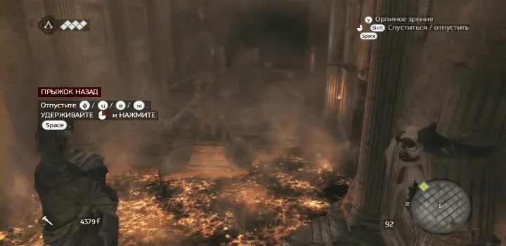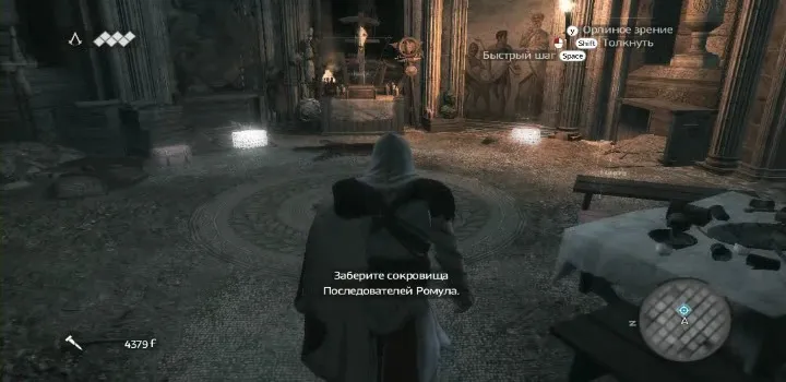 Плиты с символами вокруг нас исчезают. Бегите назад, откуда пришли. Эцио с легкой грустью разглядывает мантию Родриго Борджиа, которого он так не предусмотрительно не убил во второй части франшизы. Ассасин хочет вынуть из ниши посох, но это ему не удается и артефакт, благодаря каким-то заранее предустановленным механизмам в храме, исчезает в нише. Опускается сам пол, стены приходят в движение. Эцио пугается, но тут нас находит дядя Марио. Если не знаете что делать, следуйте подсказкам, и первая из них говорит нам, что надо включить орлиное зрение. По умолчанию – это английская «t», но радует тот факт, что в сиквеле теперь на интерфейсе вместо значков стоят наши родимые русские буквы и не нужно каждый раз заглядывать в настройки, чтобы вспомнить – а что же у нас отвечает за орлиное зрение. Нам надо идти по подсвеченной тропе. Кто, возможно, играет в данную серию игр впервые, должен уяснить, что за лазание отвечает WASD+RBM+Spase… ой, простите ЦФЫВ+ПКМ+Пробел (далее в прохождении все клавиши будут обозначаться русскими буквами - как на интерфейсе).