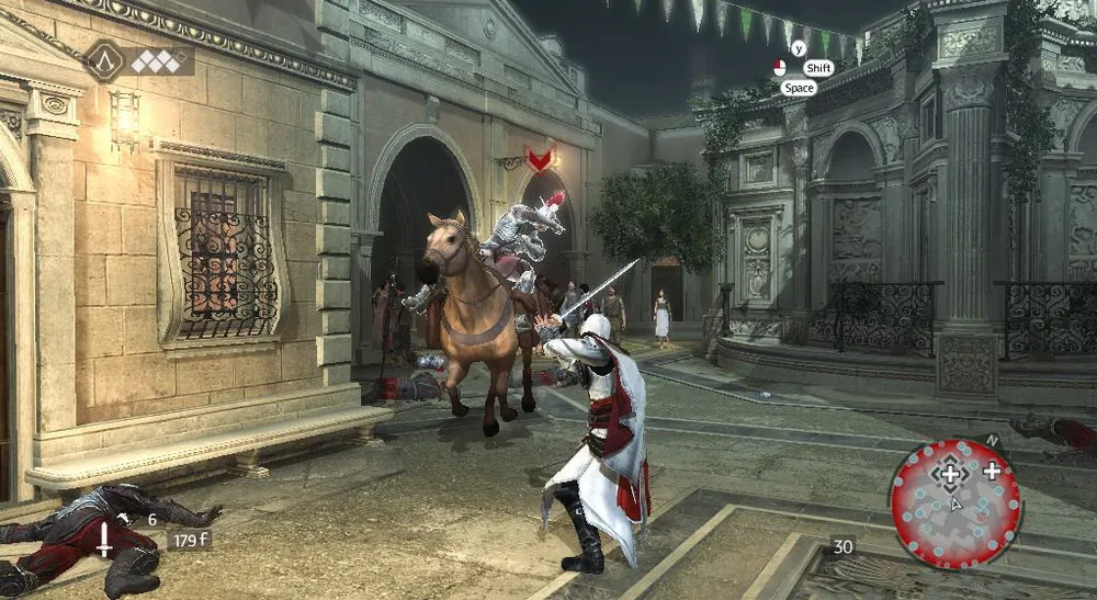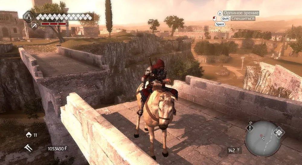 Эцио мчится на коне к южной стене, а на интерфейсе мелькает счетчик, что количество людей на вилле стремительно уменьшается. Не паникуем и едем дальше. По дороге нам этот же интерфейс сообщает, что мы теряем нашу броню и оружие. Все вокруг валится и, наконец, Эцио запрыгивает на стену.