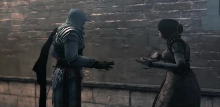 Эцио подбрасывает Кристине записку и ждет ее в назначенном переулке. Когда девушка приходит, он, не снимая маски, целует ее.