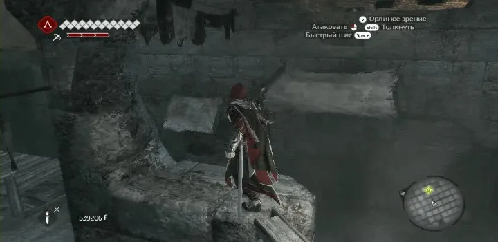 Идите во двор замка и заберитесь на укрепления. Стражников, которые будут попадаться на пути – по-тихому устраняйте. Спуститесь в самый низ внутреннего двора – затем по лестнице поднимитесь к потайной двери. Доберитесь к верхнему залу. Идите сперва к ящикам, затем поднимайтесь по уступам на стенах и пробирайтесь в правую сторону вокруг помещения.