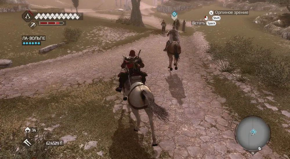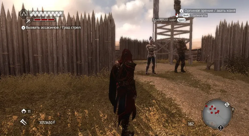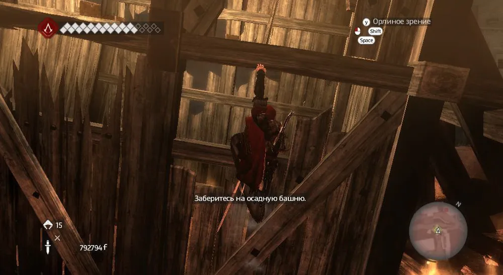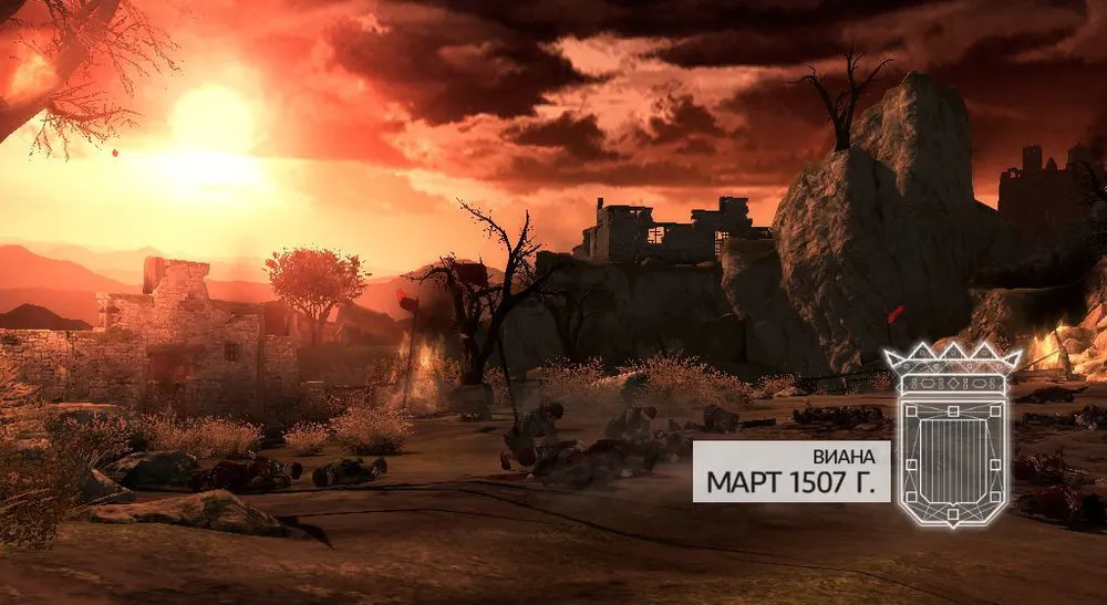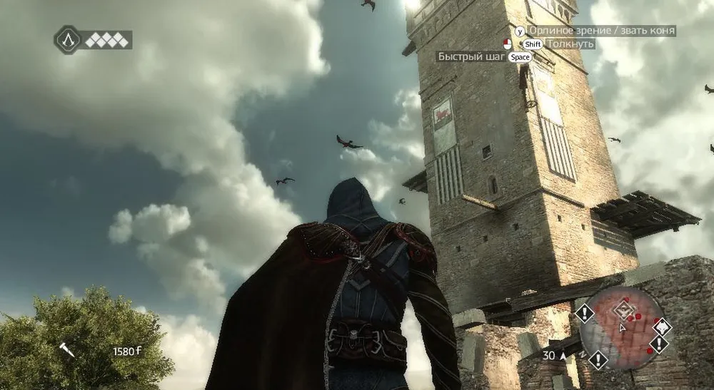 Эцио на поле битвы с Чезаре. Борджиа сбегает, натравив на нас солдат. Бьемся с солдатами, и тут нас отбрасывает ударной волной от пушечного выстрела. Эцио приходит в себя – вокруг никого и ничего, кроме горы трупов. Садитесь на коня и скачите за припасами. Не проехали и мили, как коня подбили и нужно снова топать на своих двоих. Хорошо хоть бежать недалеко. По дороге будет несколько локаций, наводненных солдатами. И, к сожалению, в следующую локацию нельзя попасть, пока не расправитесь с теми из них, которые жаждут вашей смерти. Заберитесь на осадную башню.